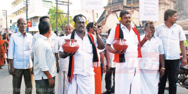 கரூர், -கரூர் நகராட்சியின் சாதாரண கூட்டம், அவசரக் கூட்டம் மற்றும் சிறப்புக் கூட்டம் நடந்தது. நேற்று மாலை 4 மணியளவில் மீண்டும் அவசரக் கூட்டம் நடைபெறும் என அனைத்துக் கவுன்சிலர்களுக்கும் சுற்றறிக்கை அனுப்பப்பட்டது.இதனால் திமுக கவுன்சிலர்கள் நாராயணன், ரவிக்குமார் ஆகியோர் காதில் பூ வைத்து, நெற்றியில் நாமம் இட்டு, ஒரு கையில் பானையையும் மற்றொரு கையில் சட்டப்பேரவையில் 110 விதியின் கீழ் கரூர் நகராட்சிக்கு அறிவித்த திட்டங்கள் எதுவும் செயல்படுத்தப்படவில்லை என்பதை வலியுறுத்தும் வகையில் ஊர்வலமாக ஆஸ்பத்திரி சாலை வழியாக நகராட்சி அலுவலகத்தை நோக்கி வந்தனர்.நகராட்சி நுழைவாயிலில் அவர்களை, டவுன் போலீசார் தடுத்தனர். ஆனாலும் இருவரும் கூட்டம் நடைபெறும் வளாகத்தை நோக்கி கோஷம் எழுப்பியபடி சென்றனர். அதிமுக கவுன்சிலர்கள் 10க்கும் மேற்பட்டோர், திமுக கவுன்சிலர்களுக்கு எதிராக கோஷங்கள் போட்டனர். பின்னர் அதிமுக கவுன்சிலர்கள் கலைந்து சென்றனர்.திமுக கவுன்சிலர்கள் இருவரும், நகராட்சி கூட்டம் நடைபெறும் அலுவலக வாயிலில் அமர்ந்து மீண்டும் போராட்டம் நடத்தினர். பின்னர் பானையை நகராட்சி வராண்டாவில் போட்டு உடைத்து விட்டு சென்றனர்.
