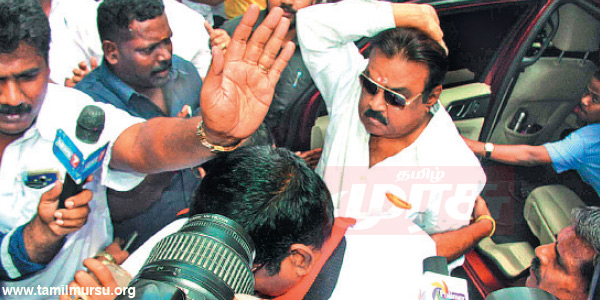 கூட்டம் ஆரம்பித்தவுடன், தேர்தல் கண்காணிப்பு அலுவலர் சேகர், வீடியோகிராபர் ஒருவருடன் மணடத்திற்கு வந்தார். அவர்களை தேமுதிகவினர் தடுத்து நிறுத்தி உள்ளே விடாமல் வாக்குவாதம் செய்தனர். கட்சியின் தலைமை நிர்வாகிகள் உத்தரவின்படி அவர்களுக்கு அனுமதி வழங்கப்பட்டது.இதனிடையே இன்று காலை 11.35 மணிக்கு தேமுதிக ஆலோசனை கூட்டம் நடந்த மண்டபத்திற்கு விஜயகாந்த் காரில் வந்து இறங்கியவுடன் பத்திரிகையாளர்கள் மற்றும் தொண்டர்கள் அவரை சூழ்ந்து கொண்டனர். இதனால் கோபமடைந்த விஜயகாந்த், பத்திரிகையாளர்களை நோக்கி அடிக்க கையை ஓங்கினார். இதனால் அதிர்ச்சி அடைந்த அனைவரும் அங்கிருந்து நகர்ந்து சென்றனர்.இதன்பிறகு மண்டபத்தை நோக்கி நடந்த விஜயகாந்திடம் தனியார் தொலைகாட்சி நிருபர் பேட்டி எடுக்க மைக்கை நீட்டினார். இதை ஆக்ரோஷத்துடன் தட்டிவிட்டு சென்ற விஜயகாந்தை தொண்டர் ஒருவர் இடித்தபடியே பின்னால் வந்து கொண்டிருந்தார். இதனால் கோபத்தின் உச்சத்துக்கு சென்ற விஜயகாந்த், தொண்டரை அடித்து தள்ளி விட்டார்.