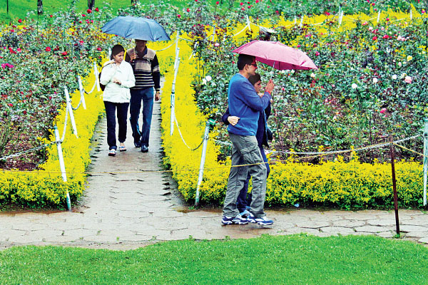 ஊட்டியில் மழை தொடர்வதால் சுற்றுலா பயணிகள் வரத்து குறைந்துள்ளது. குடை பிடித்தபடி ரோஜா பூங்காவில் பூக்களின் அழகை ரசிக்கும் ஜோடிகள்.